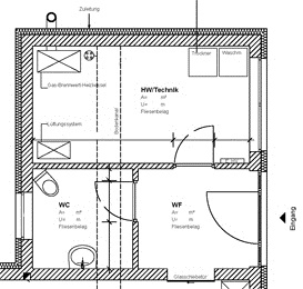 Von hier aus liegt zur Rechten der Hauswirtschafts- und Technikraum. In der Verlängerung des Windfangs gelangt man in das Gäste-WC. Dieses ist wie der Hauswirtschafts- und Technikraum, abgetrennt vom restlichen Wohnraum angebracht und dennoch schnell zu erreichen, um die Geräuschkulisse zu minimieren und die Privatsphäre zu schützen.